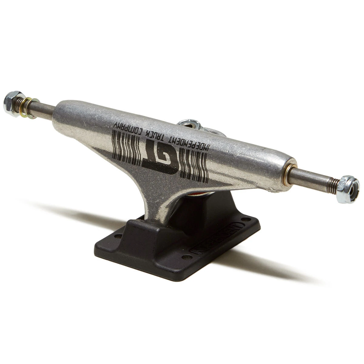 Independent Trucks Grant Taylor Pro Stage 11 Hollow features polished silver hanger with GT pad prints front and back, flat black powder coated baseplate with laser etched logo on rear kingpin housing, classic orange cushions, and silver hardware.